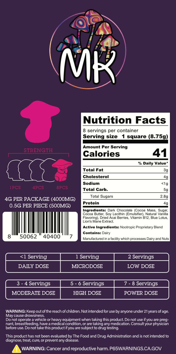 Quality control and ingredient sourcing are at the heart of the MK Acai Bliss Dark Chocolate Mushroom Bar. The MK brand ensures that every ingredient, from the dark chocolate to the acai, meets the highest standards. We carefully source our adaptogenic mushrooms to ensure that only the finest components make it into the MK blend, enhancing the chocolate’s functional benefits. This dedication to quality allows us to offer a chocolate bar that is both delicious and reliable.