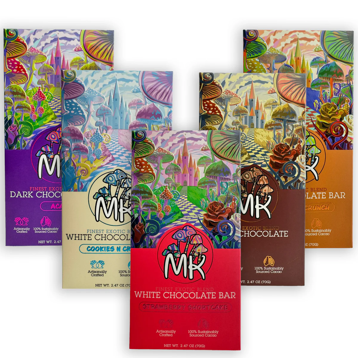 At the heart of every MK chocolate bar lies our unique MK blend of carefully selected adaptogenic mushrooms and blue lotus flower. This proprietary combination is the result of extensive research and a deep understanding of the synergistic effects of these natural ingredients. We have chosen lion’s mane for its cognitive-enhancing properties and blue lotus flower for its calming and mood-balancing effects. Our mushroom blend is carefully balanced to deliver a holistic approach to wellness, promoting mental clarity, emotional balance, and overall vitality. Experience the difference that a thoughtfully crafted mushroom blend can make with the MKbrand premium mushroom chocolates. From our classic milk chocolate bar to our adventurous matcha yuzu crunch, each flavor is a testament to our dedication to quality and innovation. With the MK brand’s offerings, you can easily elevate your day.
